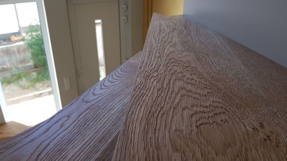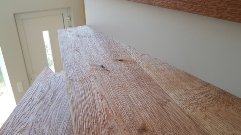 Stark gebürstete Landhausdiele mit Treppenverkleidung