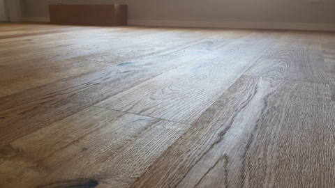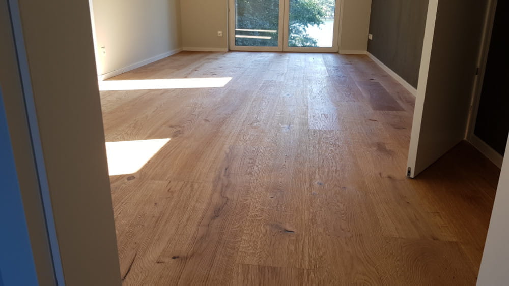 Landhausdiele auf DIN-gerechten Untergrund vollflächig im wilden Verband verklebt + Ersteinpflege und Treppe mit selbigem Material verkleidet. PARAT Vintage 260 Eiche XL LHD 2200 x 260 x 15mm, natur geölt, Drop Down stark gebürstet, 1-Stab