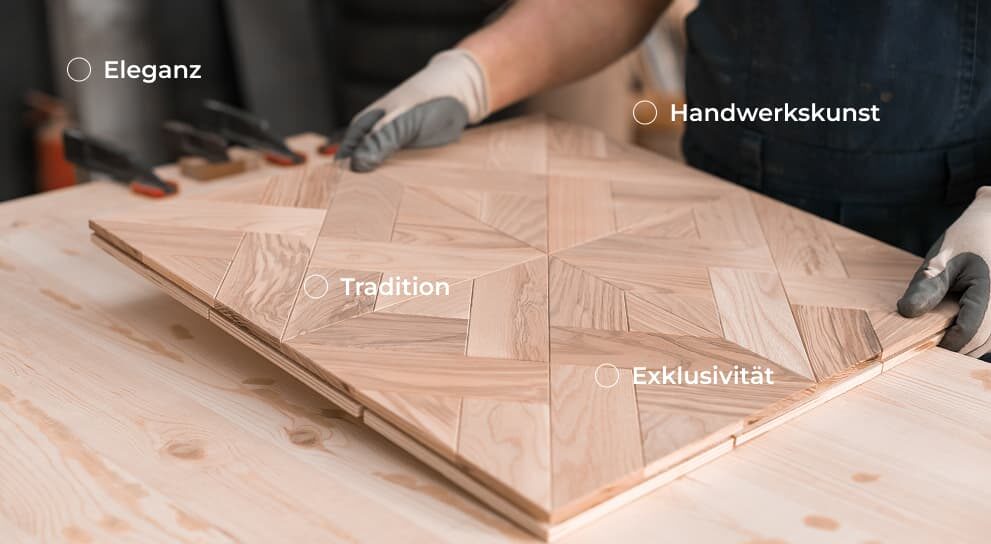 Tafelparkett zeichnet sich durch handwerklich filigrane Intarsien und Muster aus – beispielsweise Sterne, Rauten oder Würfel. Die einzelnen Holzstücke werden passgenau zusammengesetzt und auf einer Trägerplatte vollflächig verklebt, oft ergänzt durch ein umlaufendes Fries – so entsteht ein hochwertiges Design-Meisterstück.