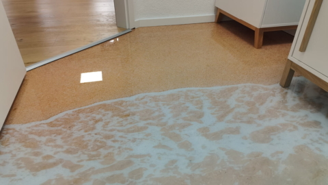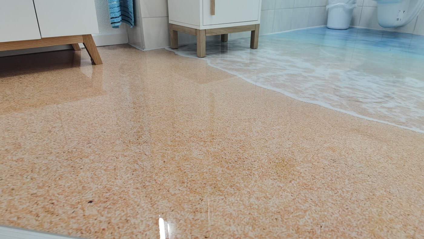 Das 3D-Motiv wurde am Stück auf dem Untergrund verklebt. Mehrere Schichten Epoxid-Harz dienen als klare und durchsichtige Endversiegelung. Das Ergebnis: ein robuster, pflegeleichter und fugenloser Boden in individueller Optik.