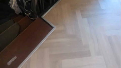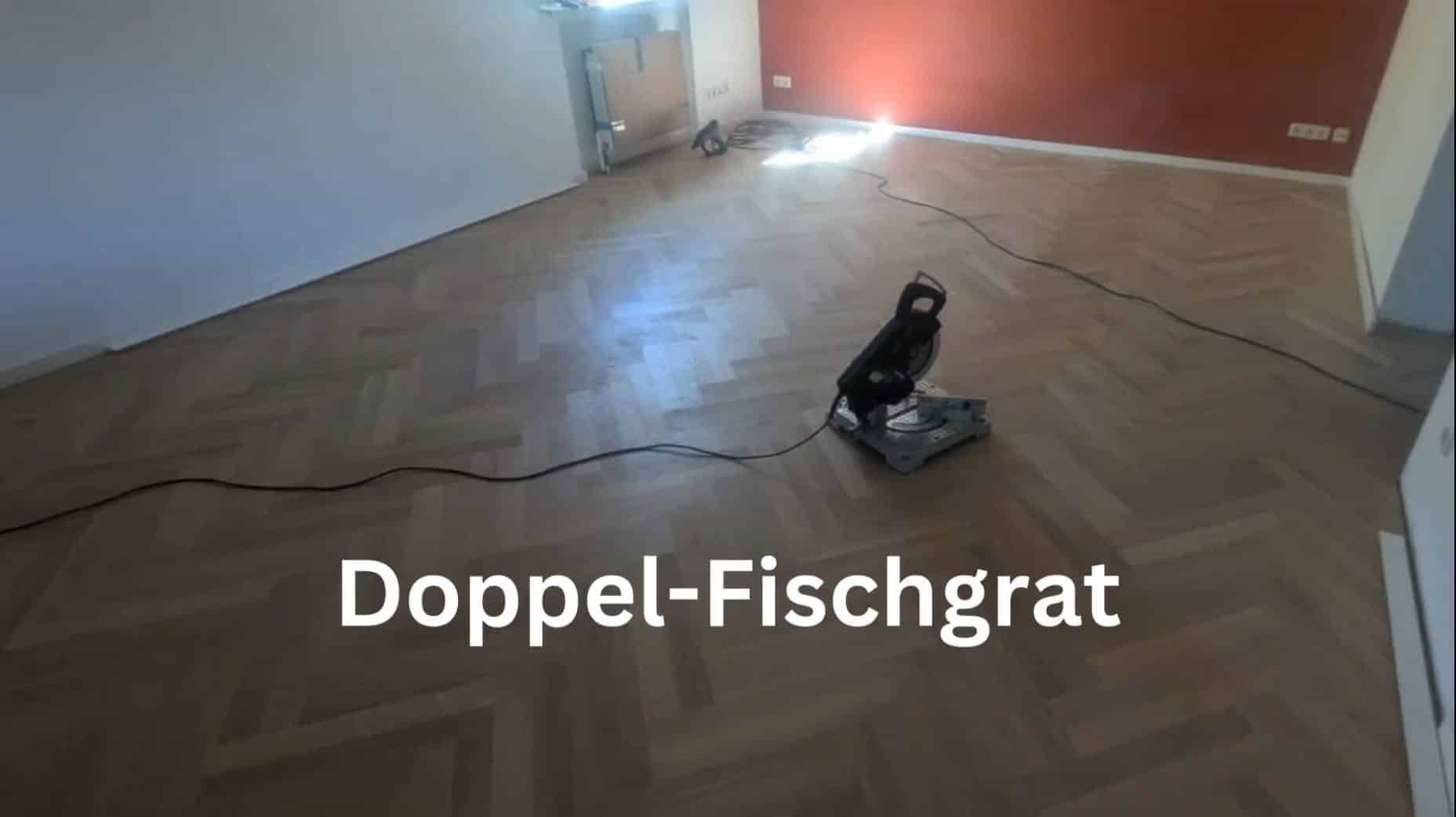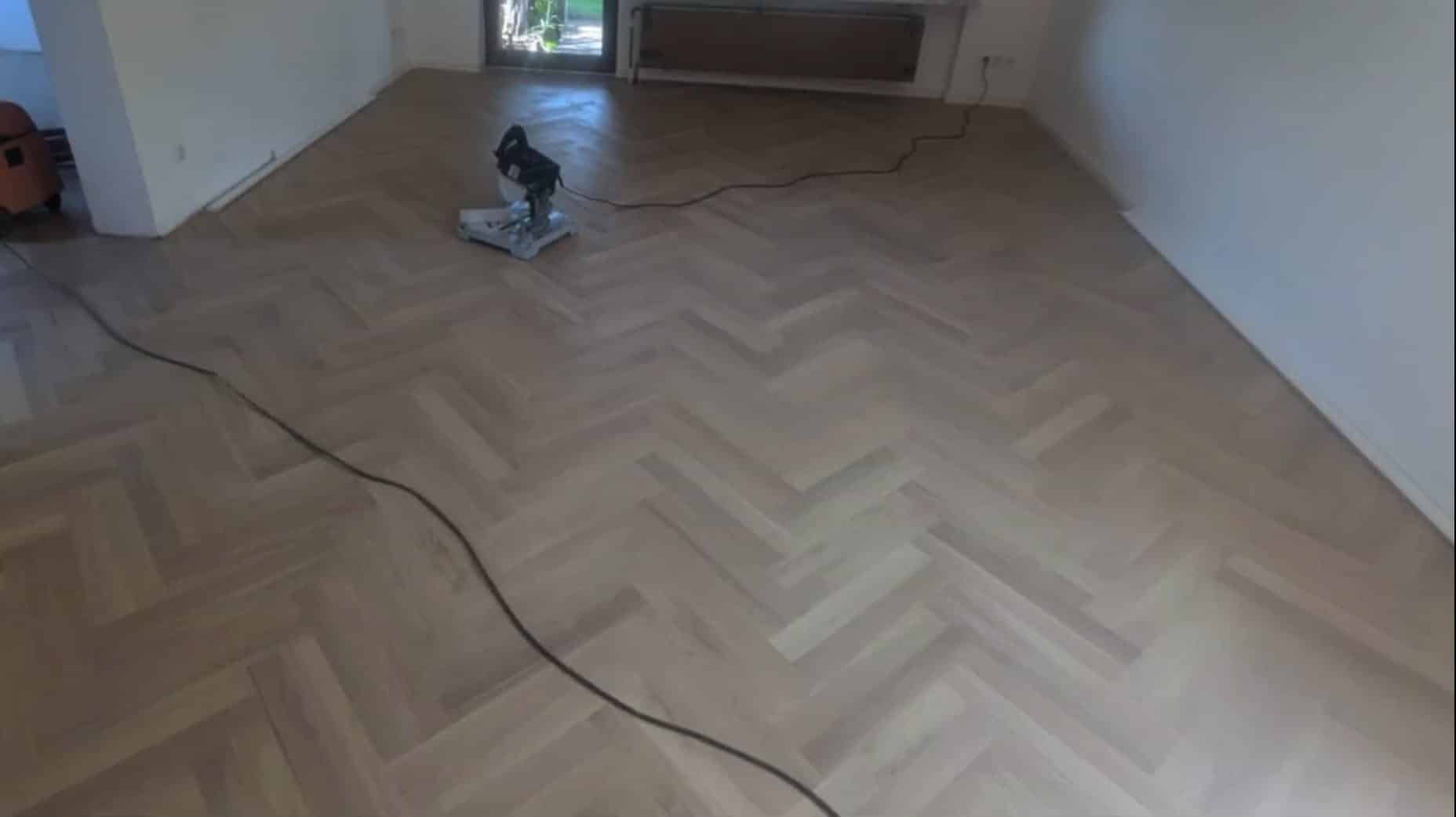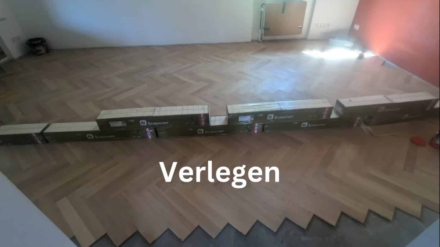 Dann eine vollflächige Verklebung als Doppel-Fischgrat von 2-Schicht-Parkett.