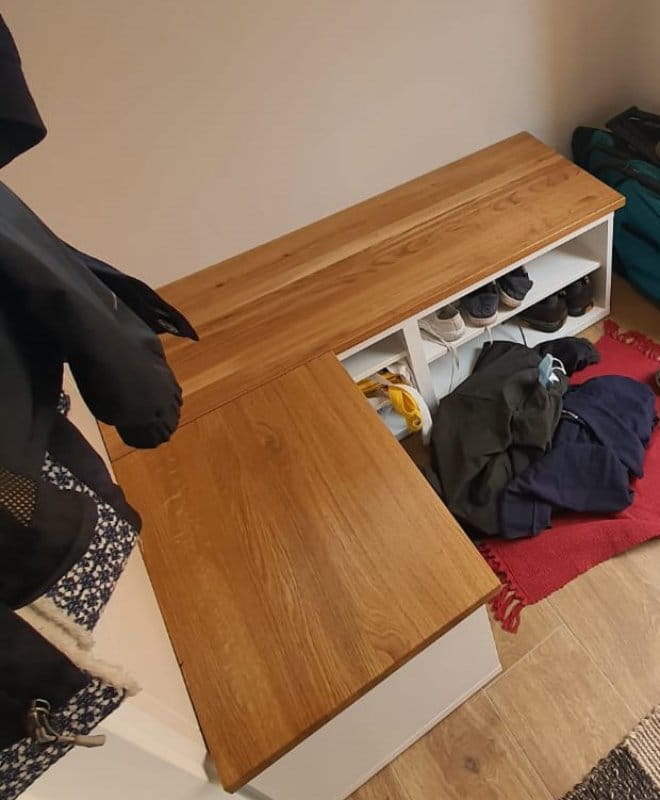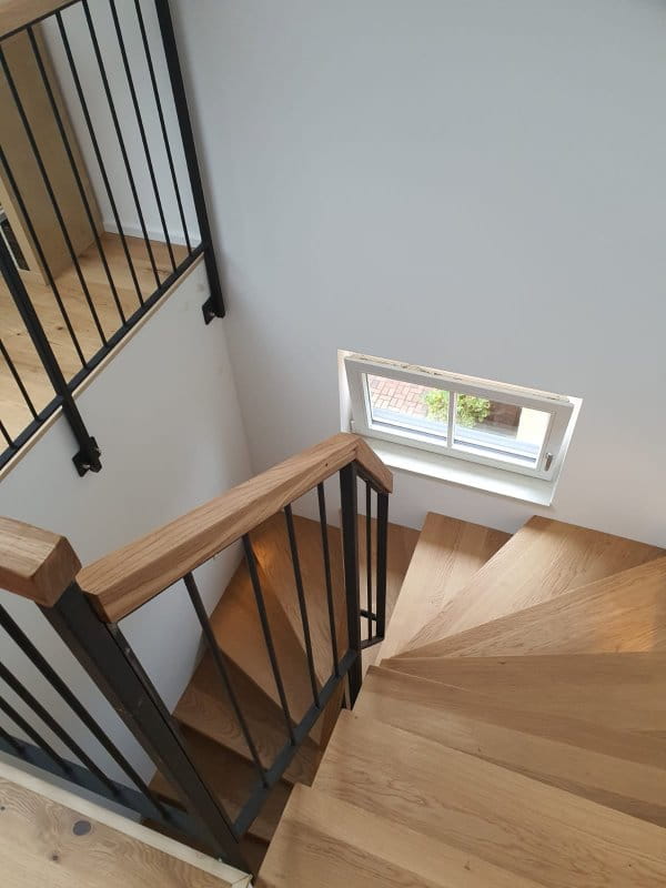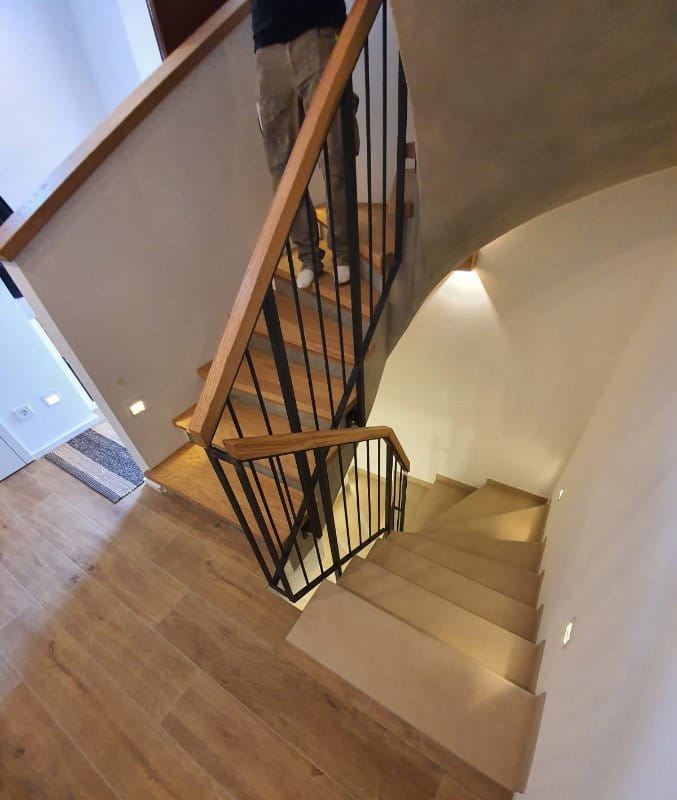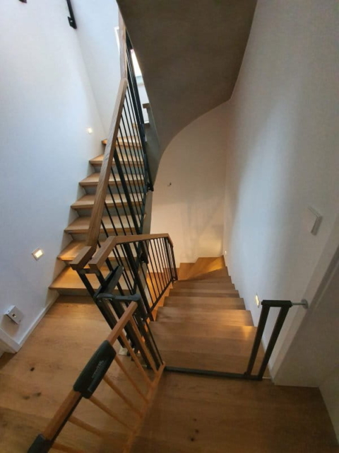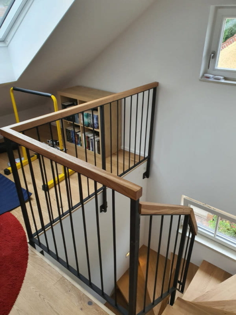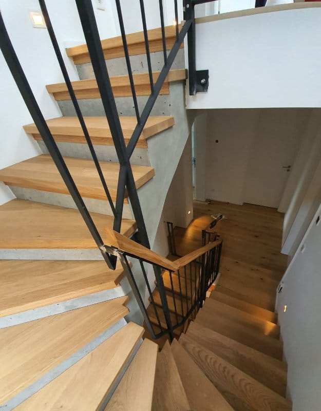 Handlauf in cubischer Form in Eigenherstellung aus Rohware (Eichenholz), aufgeschraubt auf ein Eisengestell. Dazu Ikea-Schränke mit Eichenholzplatten als Ablage verschraubt und Treppenstufen mit selbigem Material verkleidet, ohne Setzstufen.