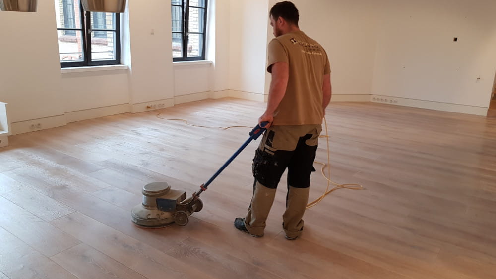 Reinigung mit Kärcher-Maschine und Gerbsäurenentferner, neutralisieren, trocknen, Weißöl auftragen, mit Einscheibemaschine nachbehandeln