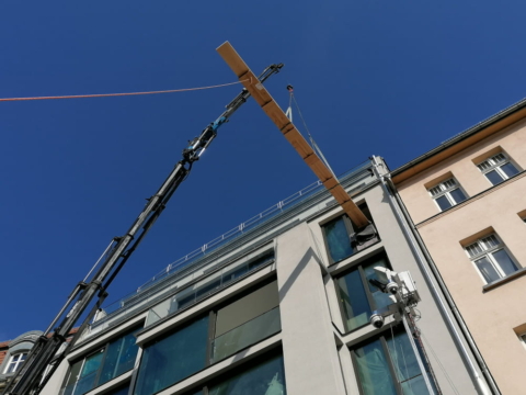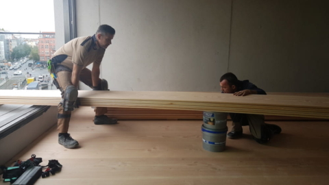 Massiv Dielen mittels eines Baukrans in die 4. Etage befördert, verklebt und raumlang verlegt, gelaugt und Endölung mit Extra-Weiß (Woca), Austrittsstufe aus Kantholz + OSB-Platten gefertigt und mit Douglasie-Dielung verkleidet. Raumlängen von 3660 – 9600 x 305 x 27mm